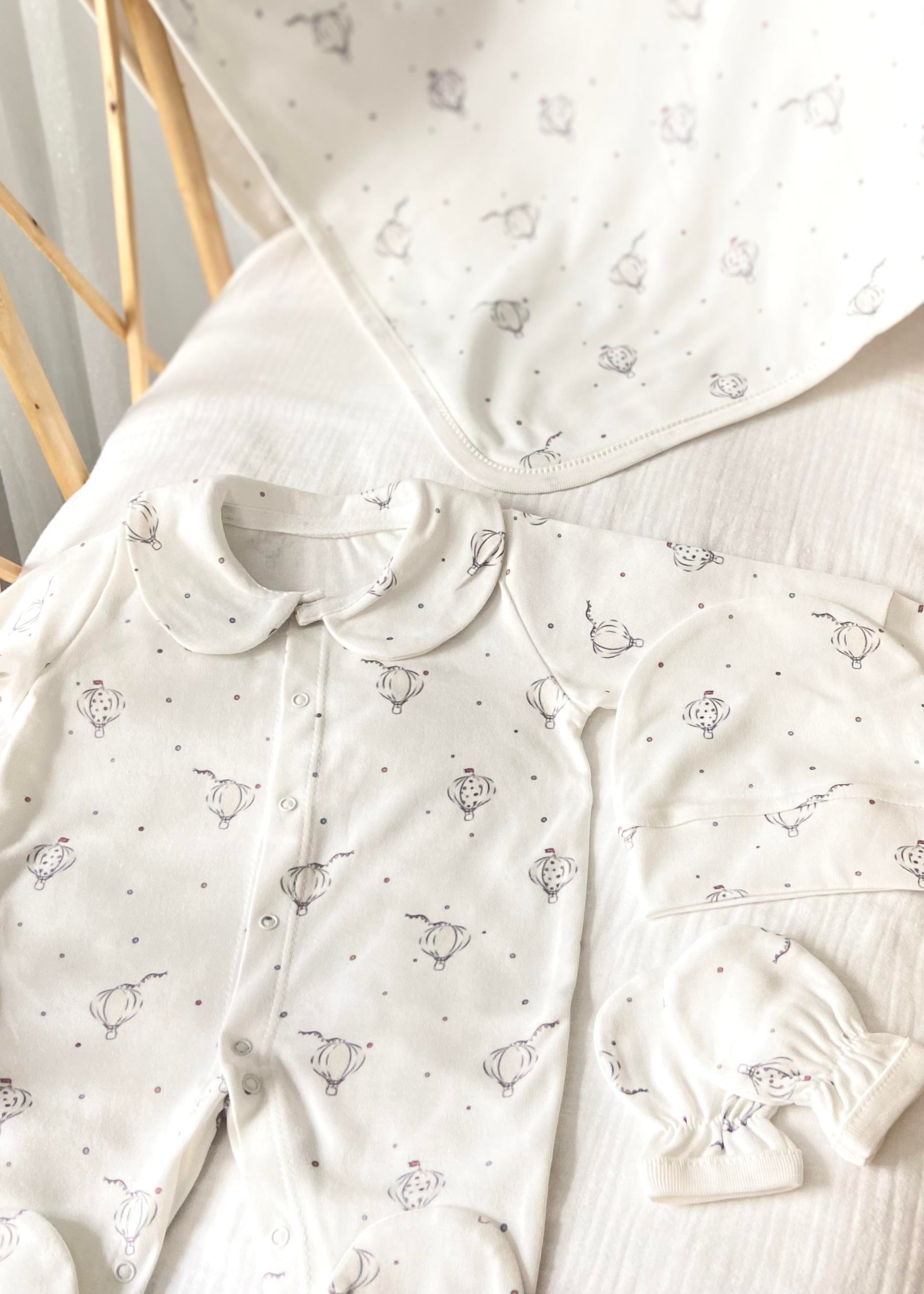 The set, consisting of a onesie with footed mittens, a mittens, a beanie, and a combed cotton blanket, provides your baby with warm protection in their first days.