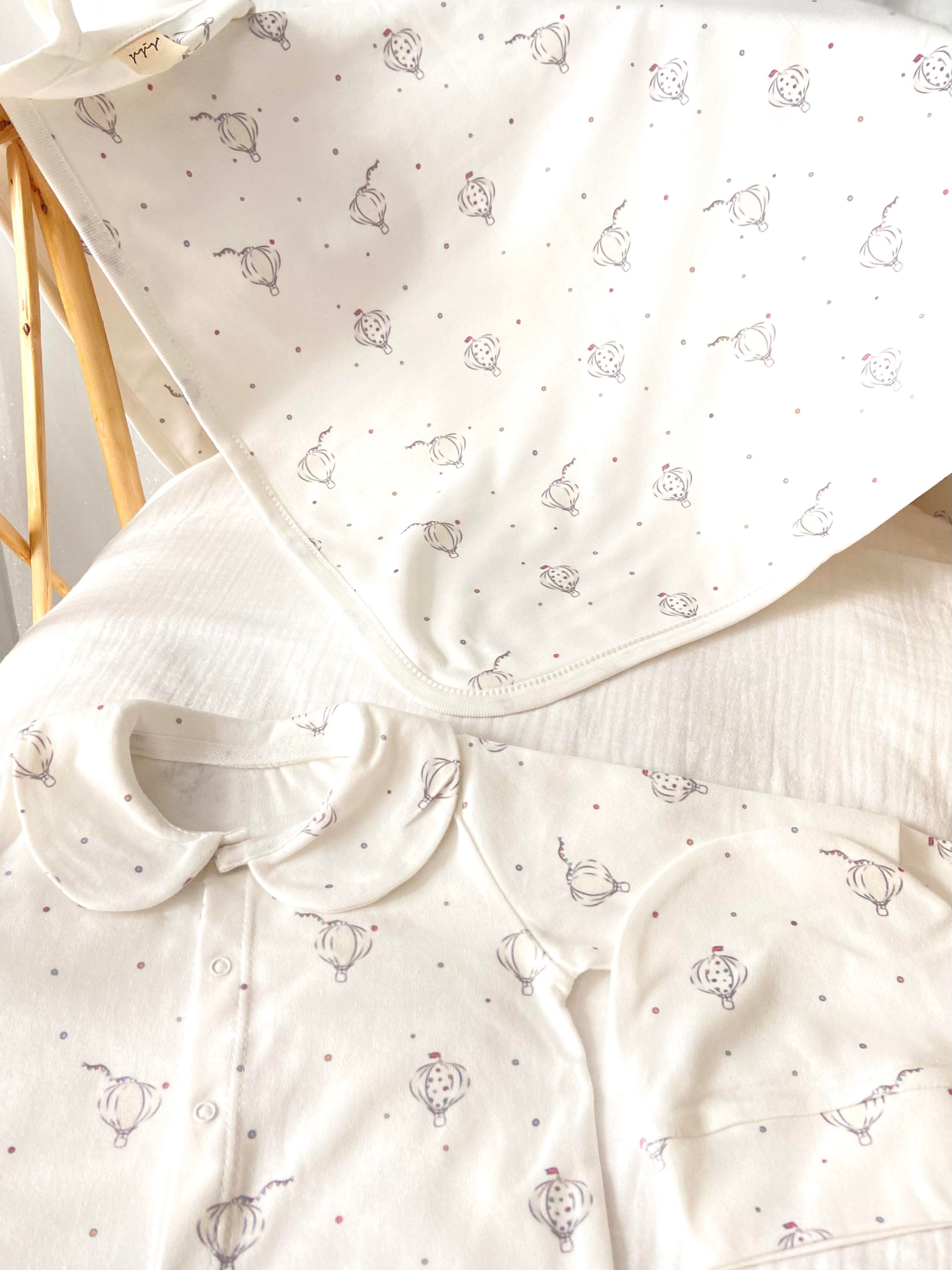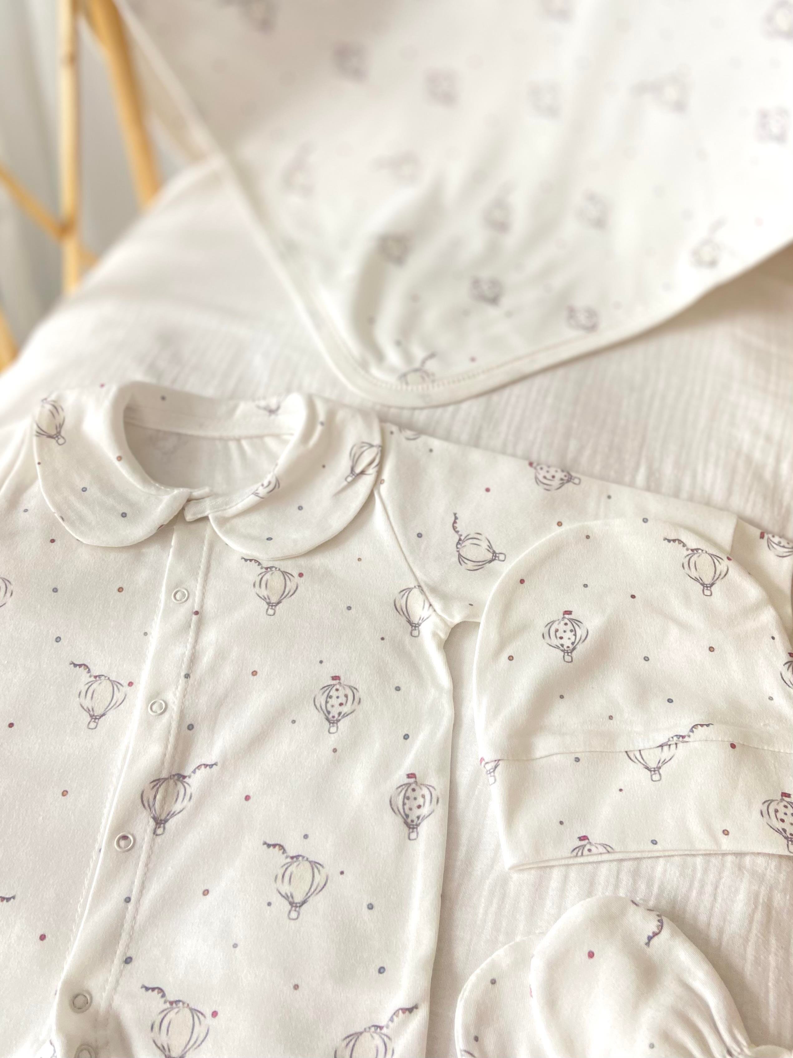A special, stylish, and soft start to your baby's first moments. Made from high-quality 100% cotton, our hospital set, printed with organic dyes, is gentle on your baby's skin.