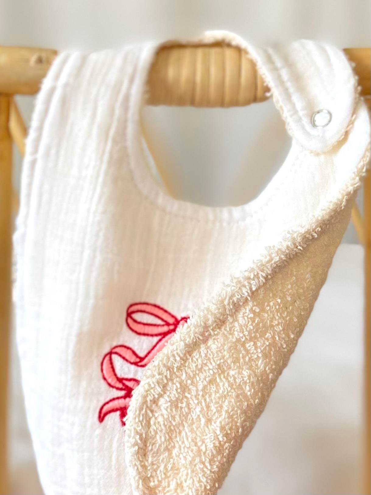 One ​​side is made of double-layer muslin and the other side is terry cloth. One side has embroidery.