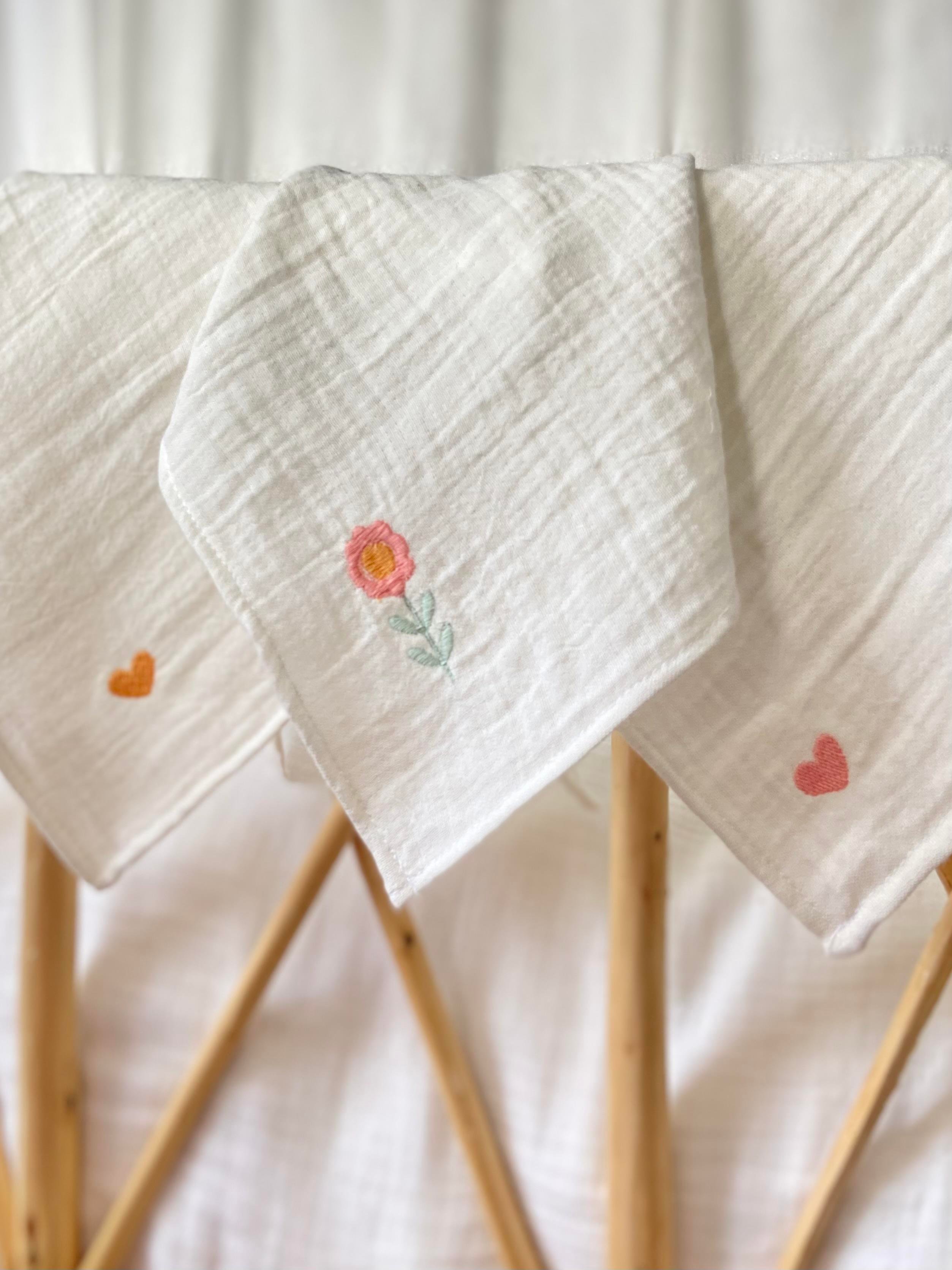 Flower and Heart Embroidered Muslin Handkerchief Set (3 Pieces)