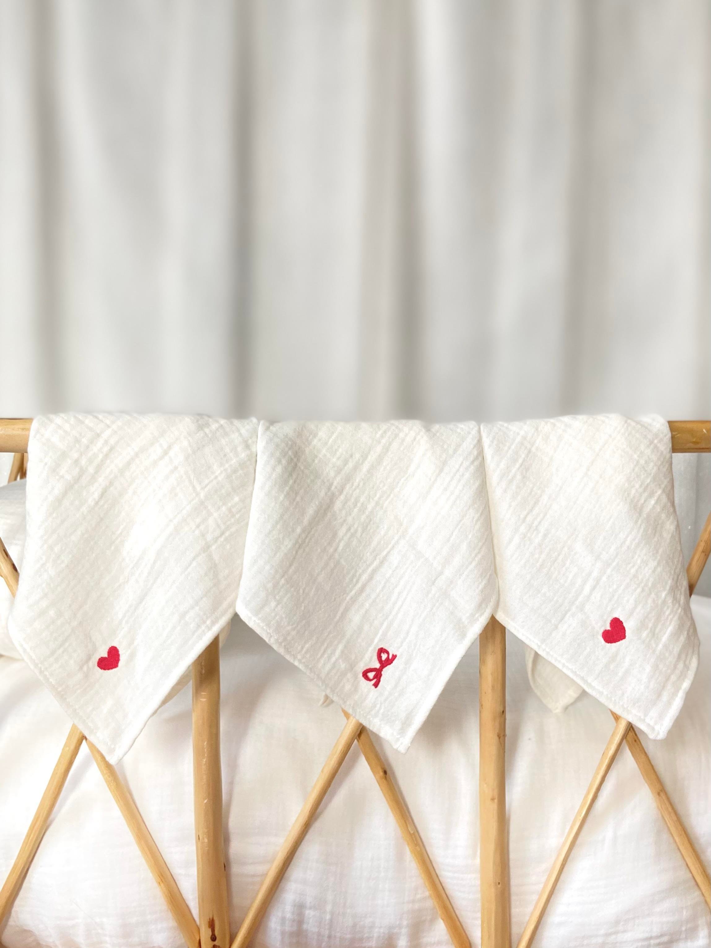 Red Heart and Bow Embroidered Muslin Handkerchief Set (3 Pieces)