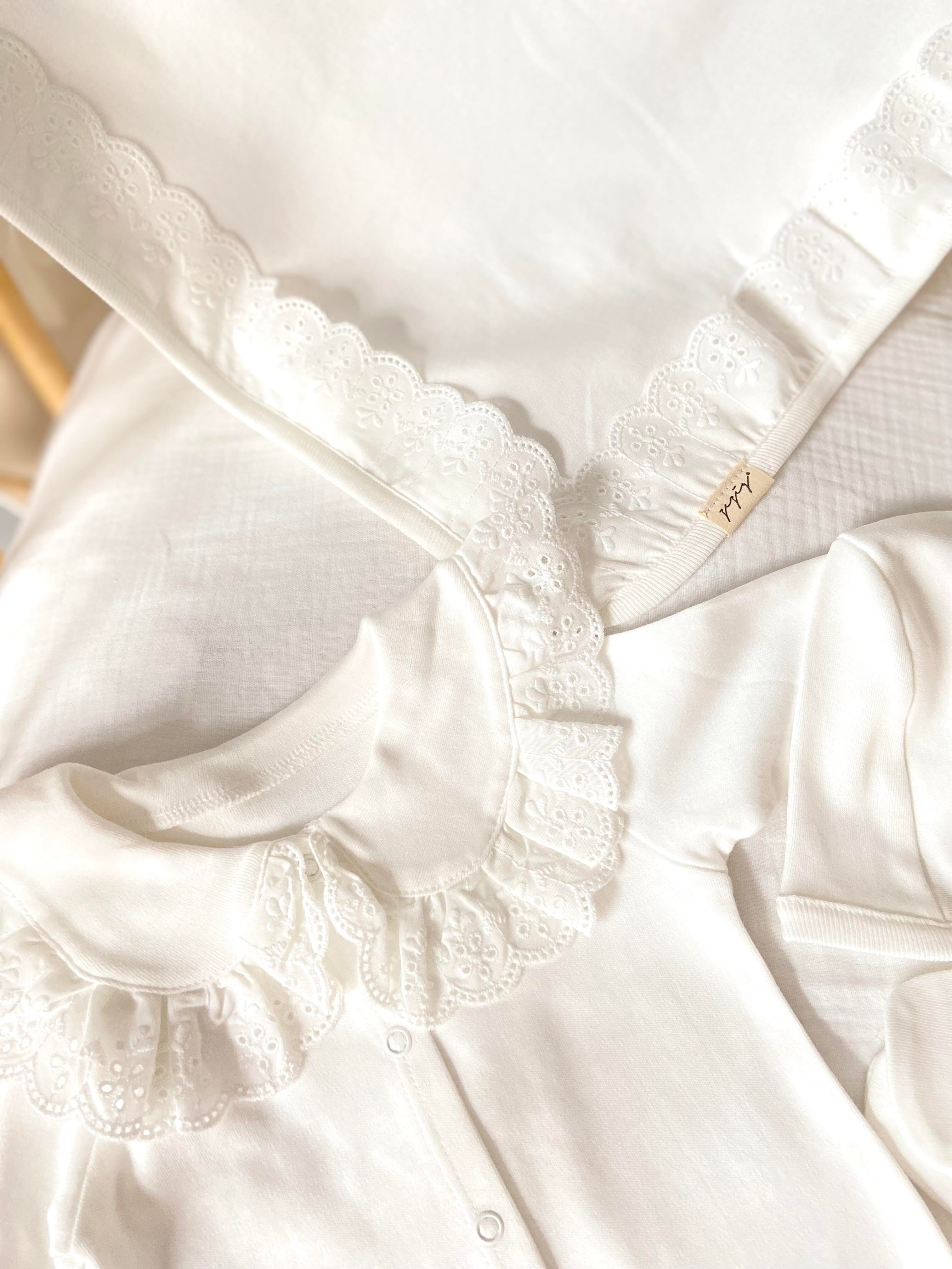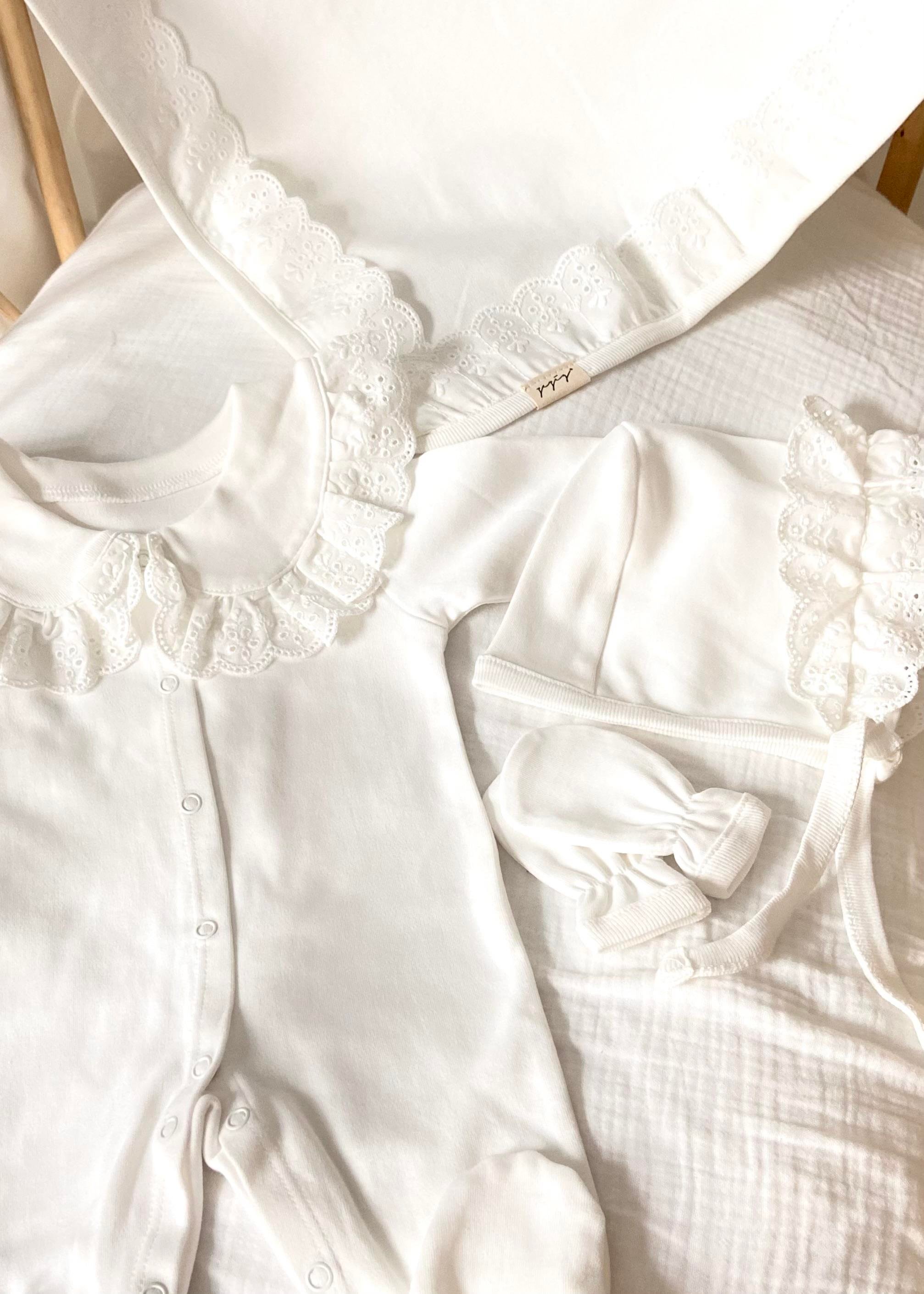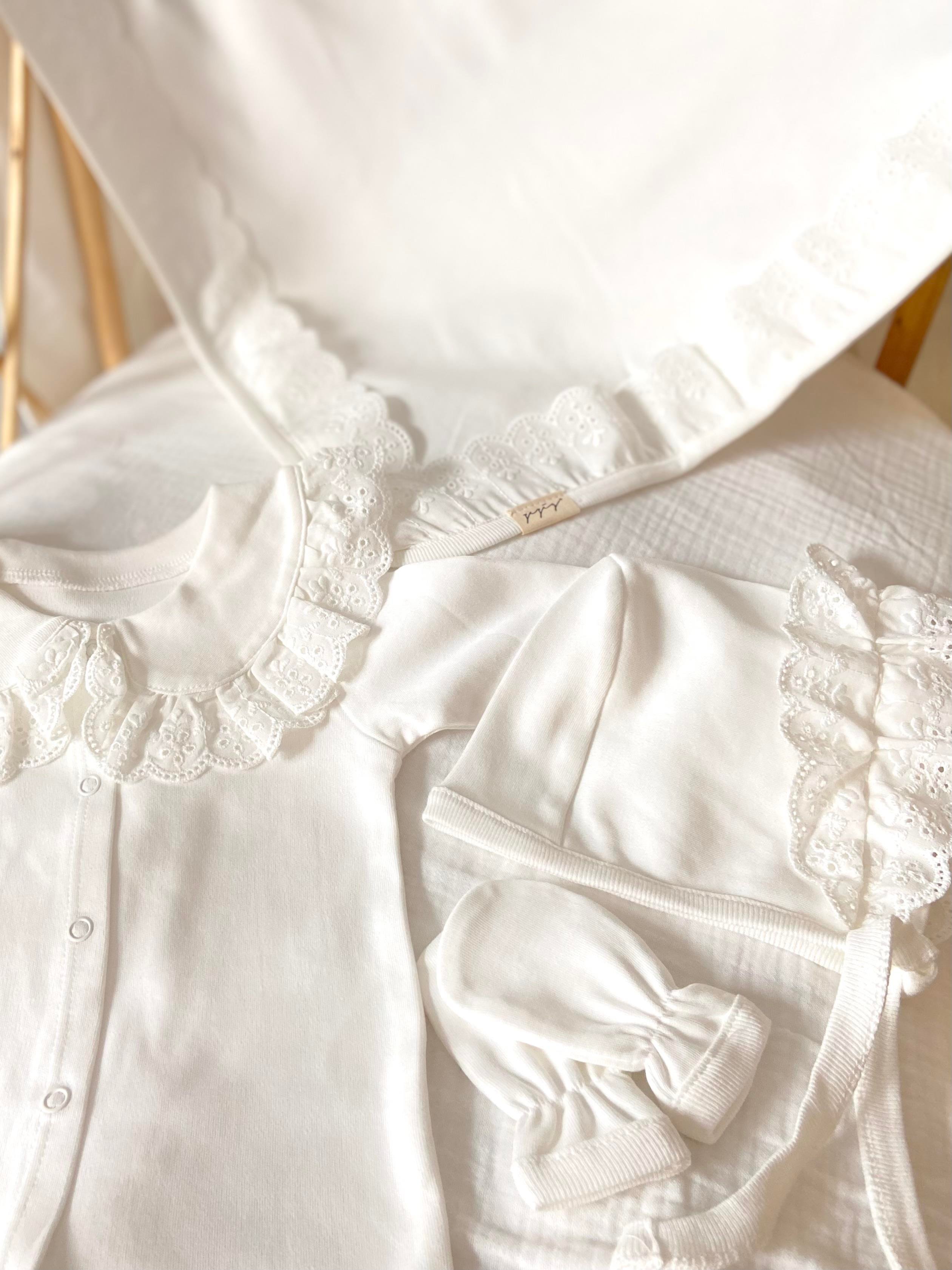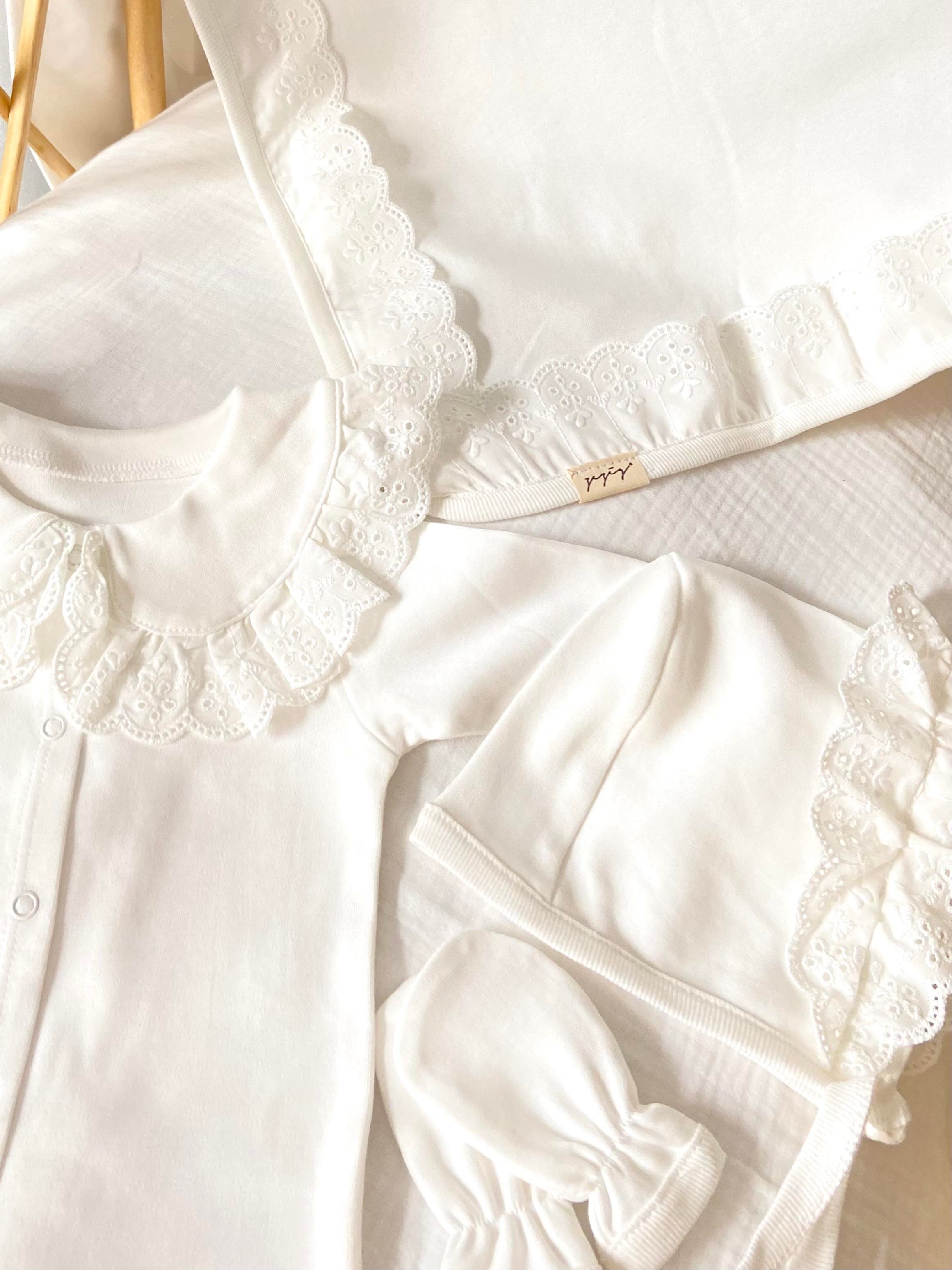 A special, stylish, and soft start to your baby's first moments. Made from high-quality 100% cotton combed cotton and 100% cotton festoon, our hospital set is gentle on your baby's skin.