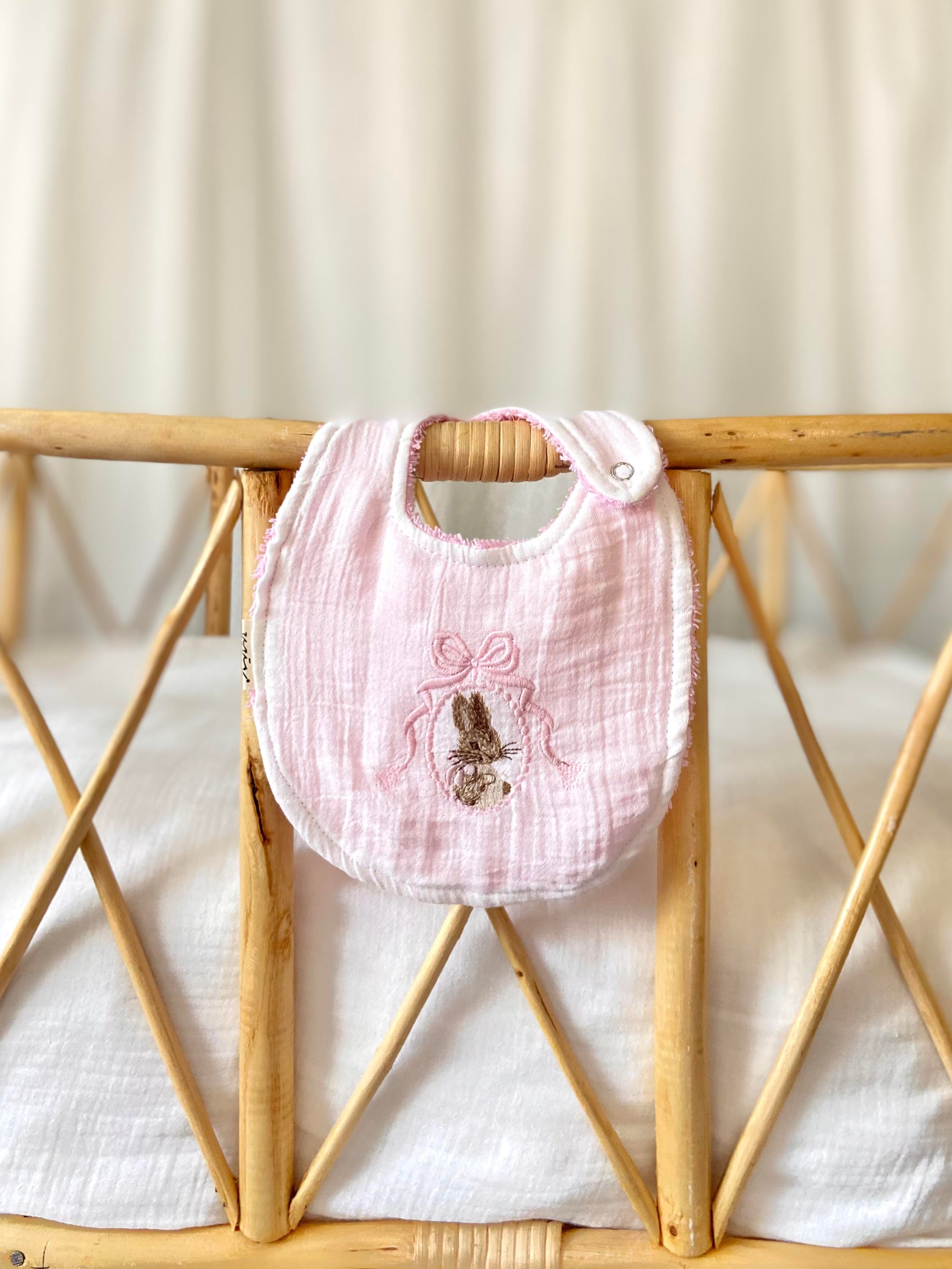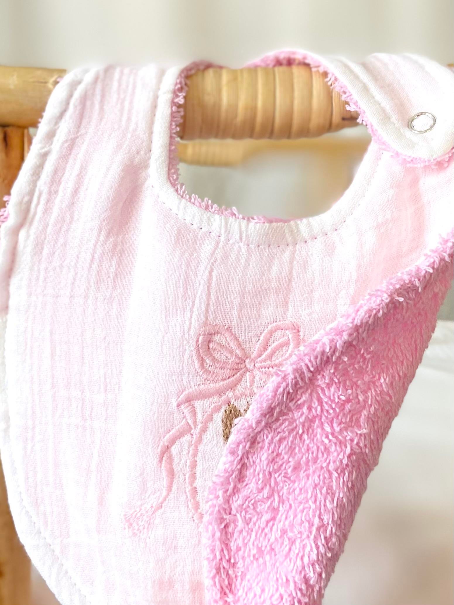 One ​​side is made of double-layer muslin and the other side is terry cloth. One side has embroidery.