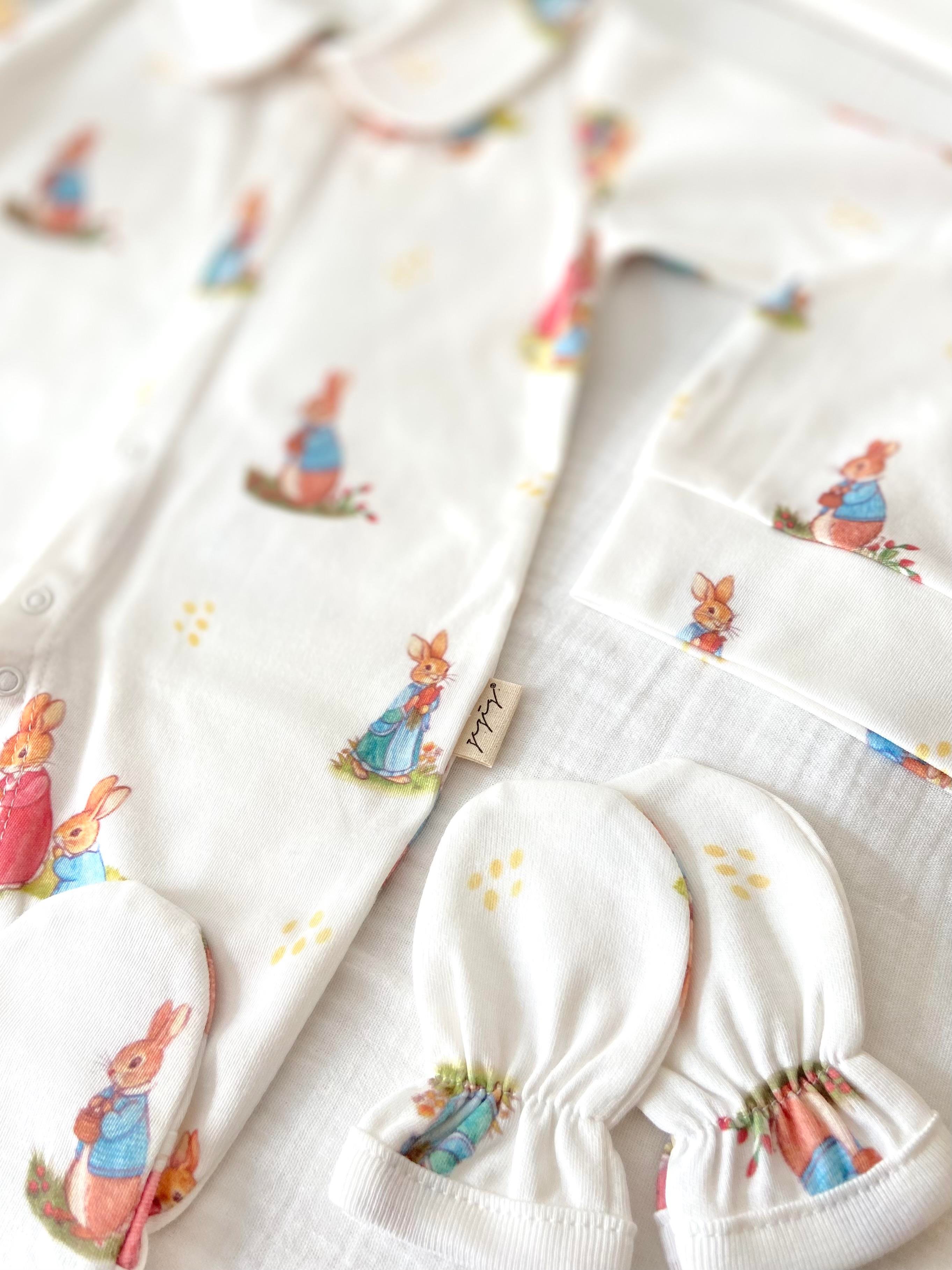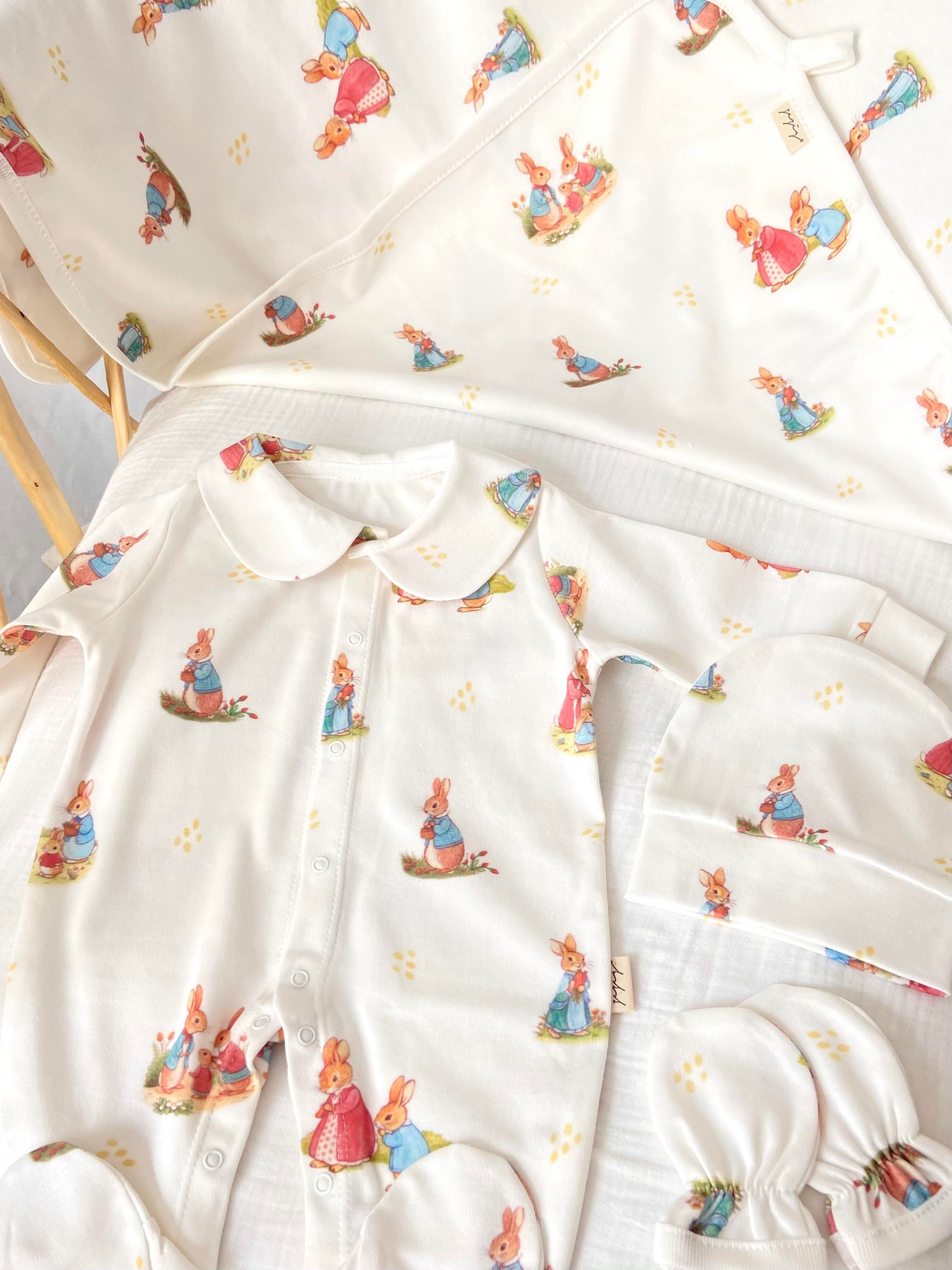 The set, consisting of a onesie with footed mittens, a mittens, a beanie, and a combed cotton blanket, provides your baby with warm protection in their first days.