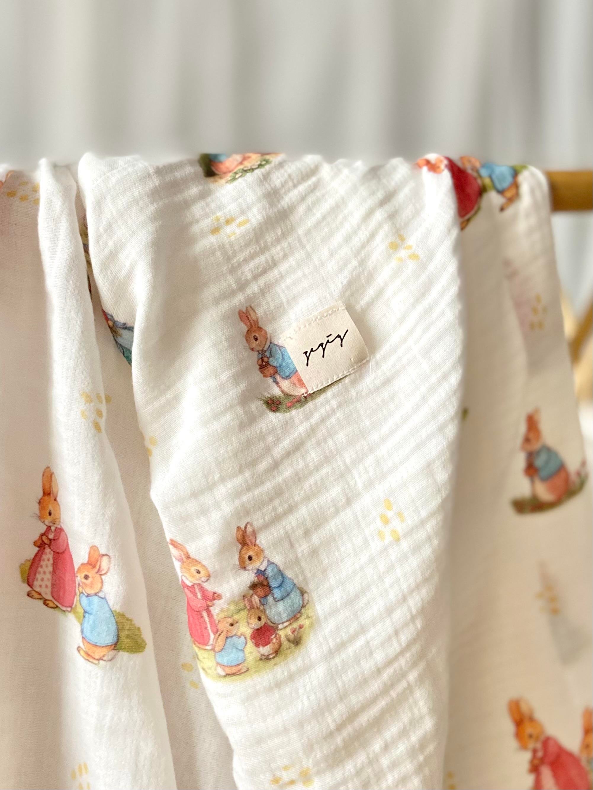 100% cotton double-layered woven muslin blanket. Printed with organic dyes.