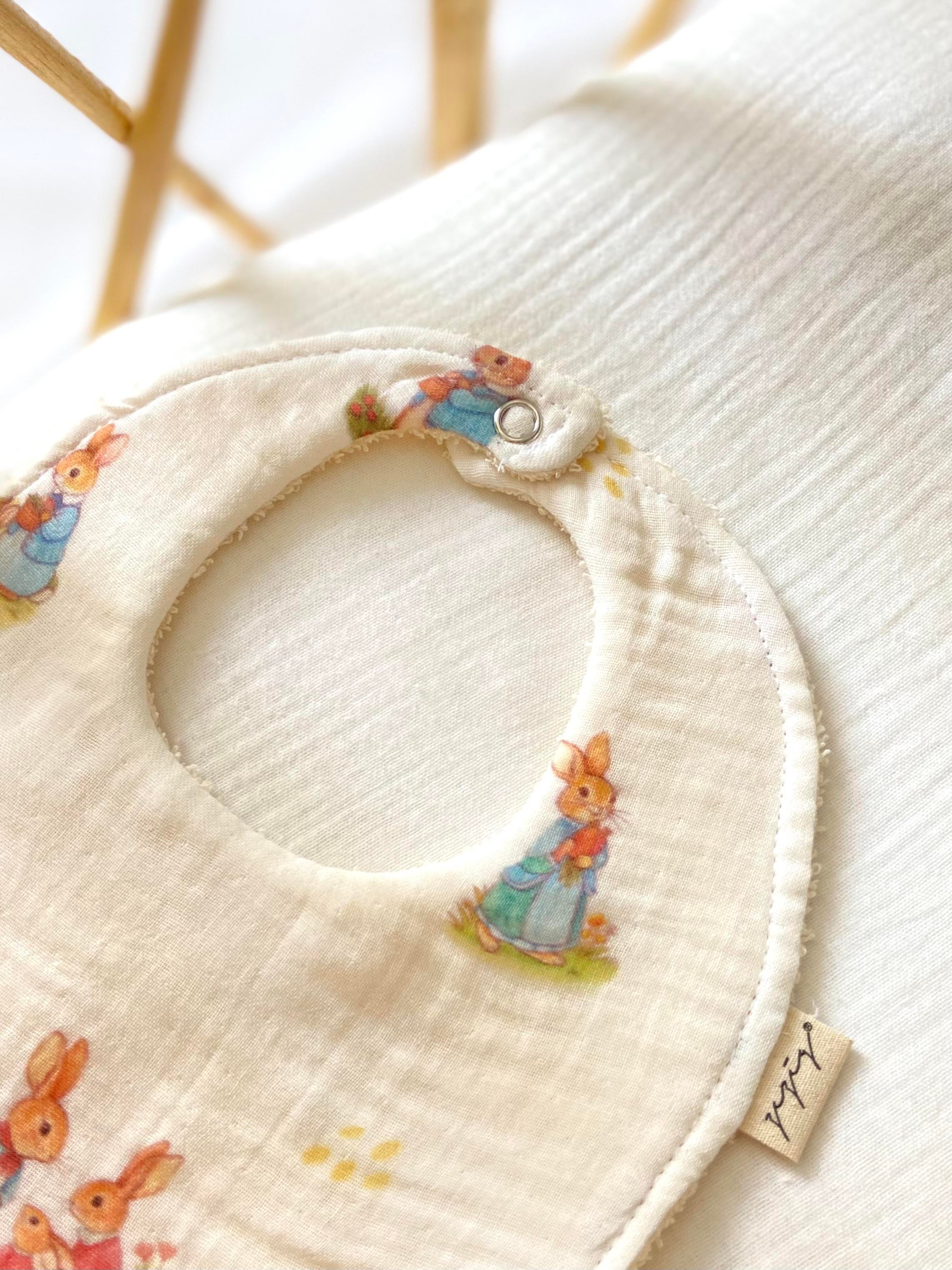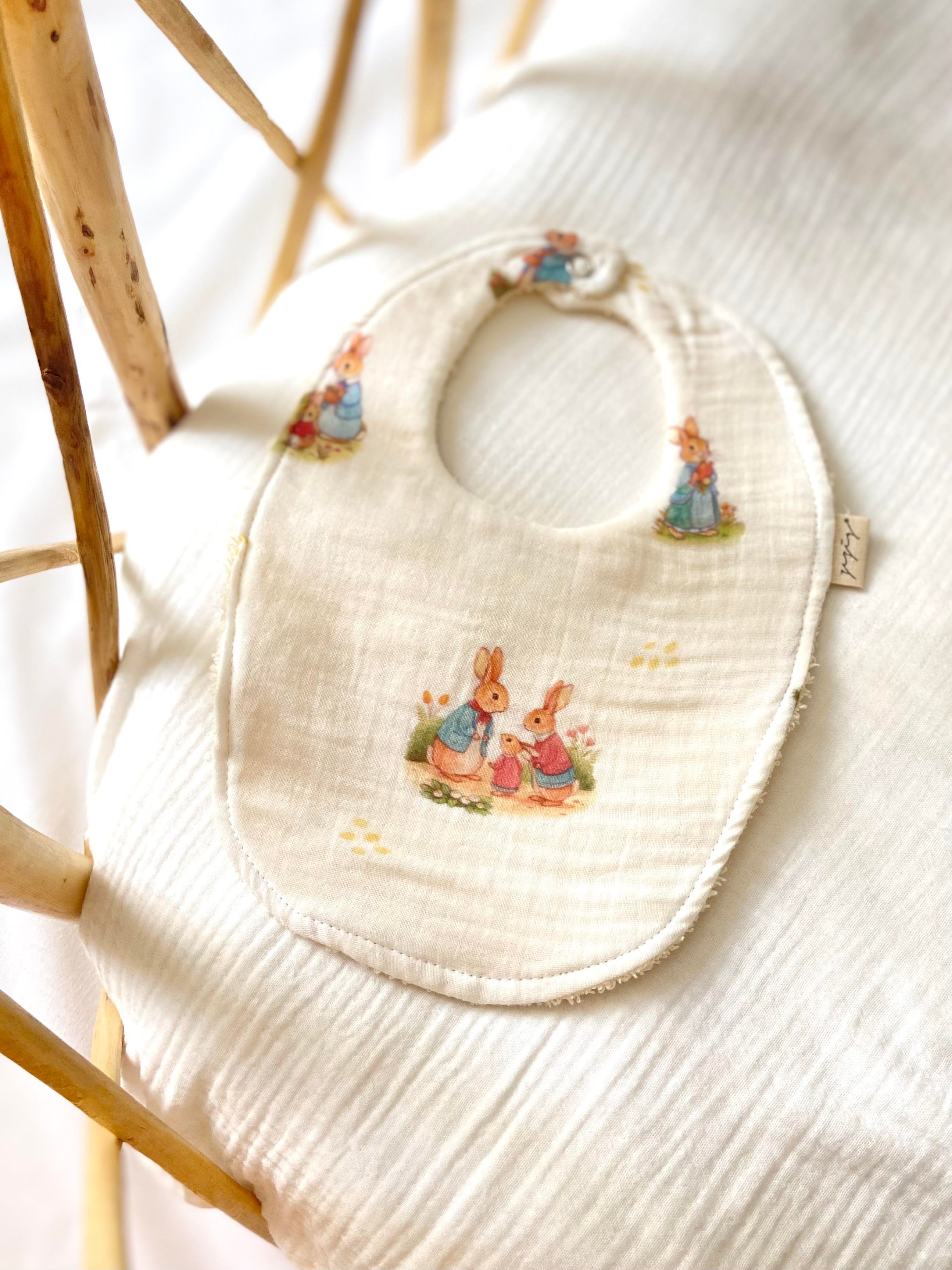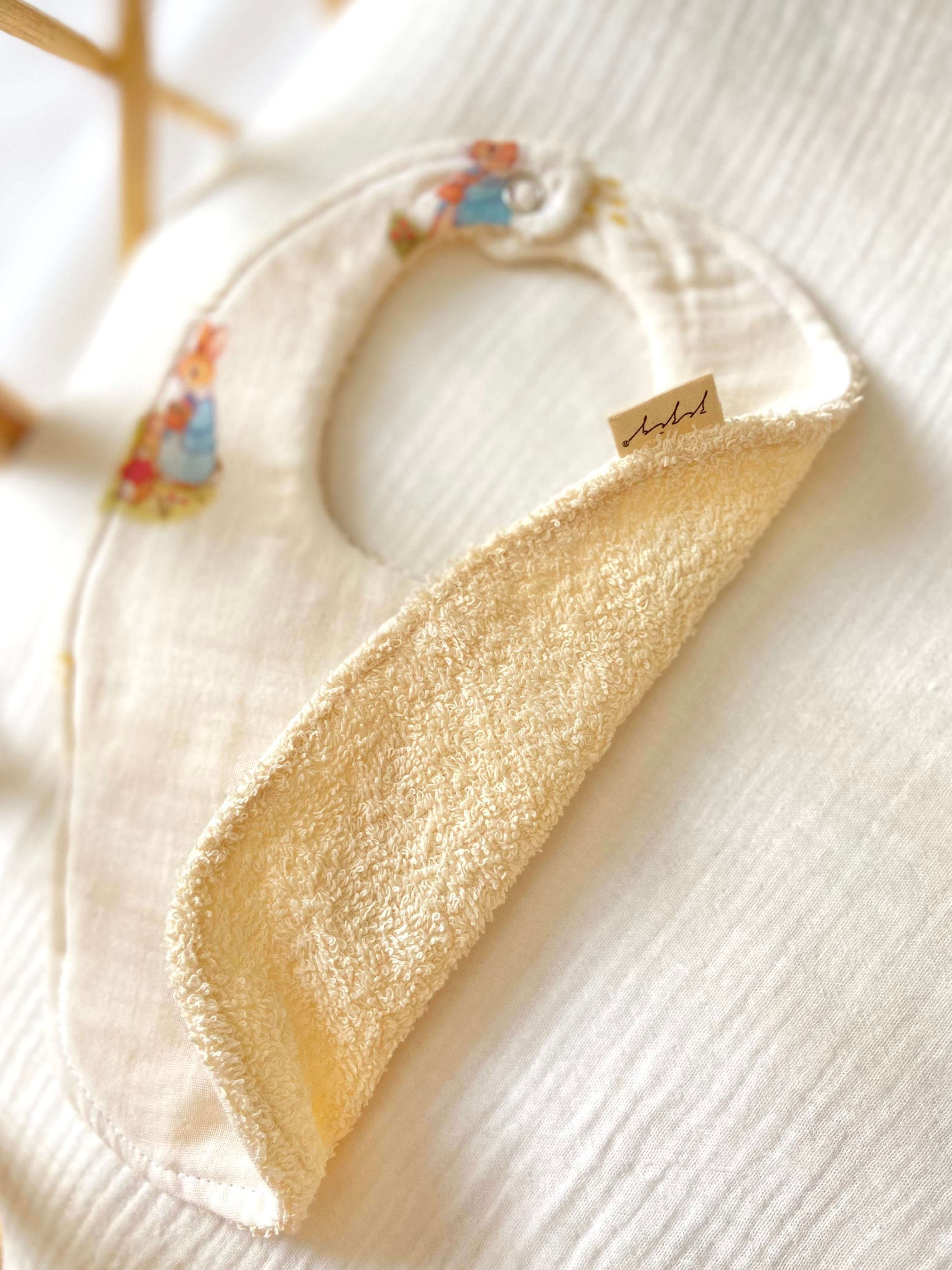 One ​​side is made of double-layer muslin and the other side is terry cloth. It features a single-sided print. Organic dyes were used in the print. Both sides are 100% cotton.