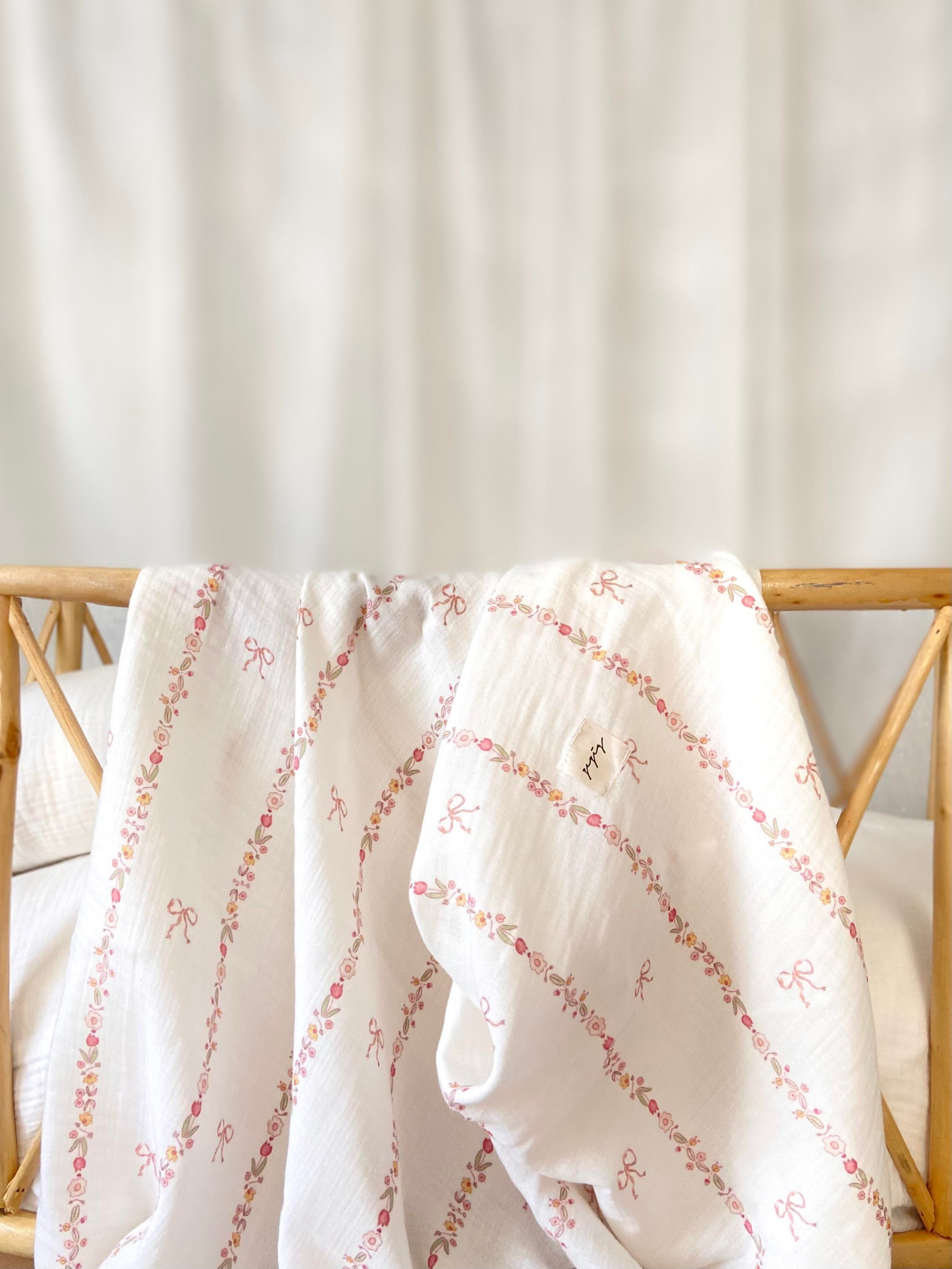 100% cotton double-layered muslin blanket. Printed with organic dyes.