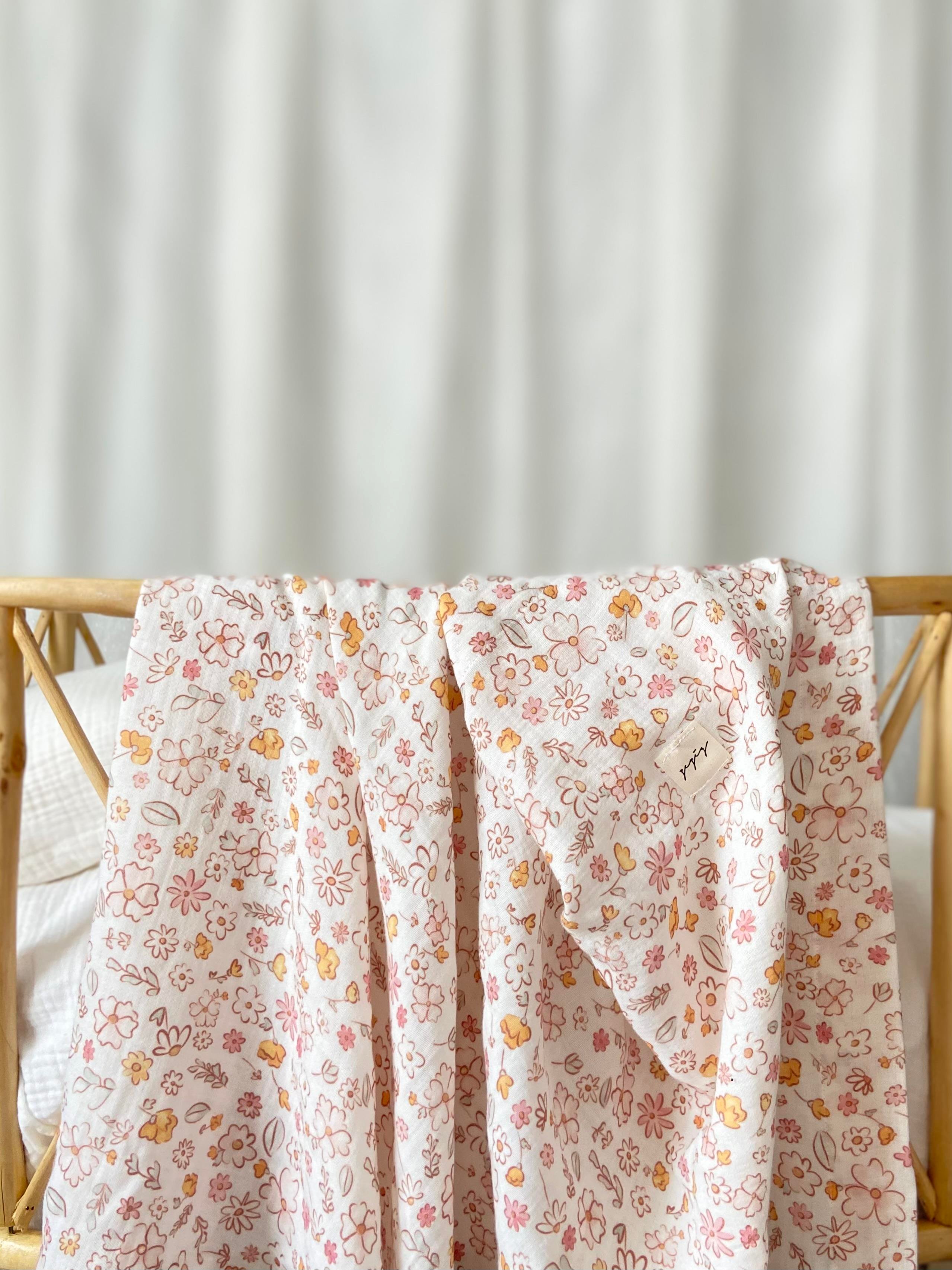 %100 pamuk çift kat dokunmuş müslin örtü. Baskısında organik boya kullanılmıştır.