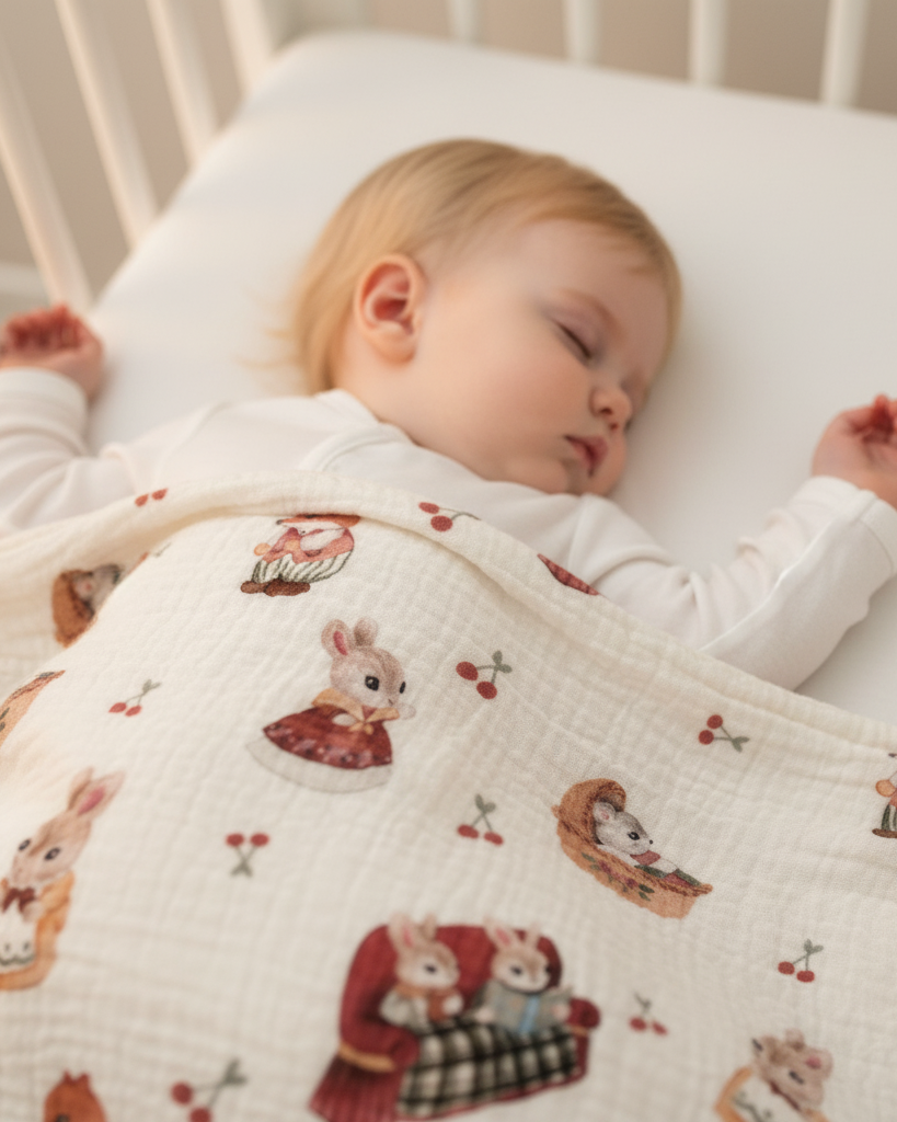 %100 pamuk çift kat dokunmuş müslin örtü. Baskısında organik boya kullanılmıştır.
