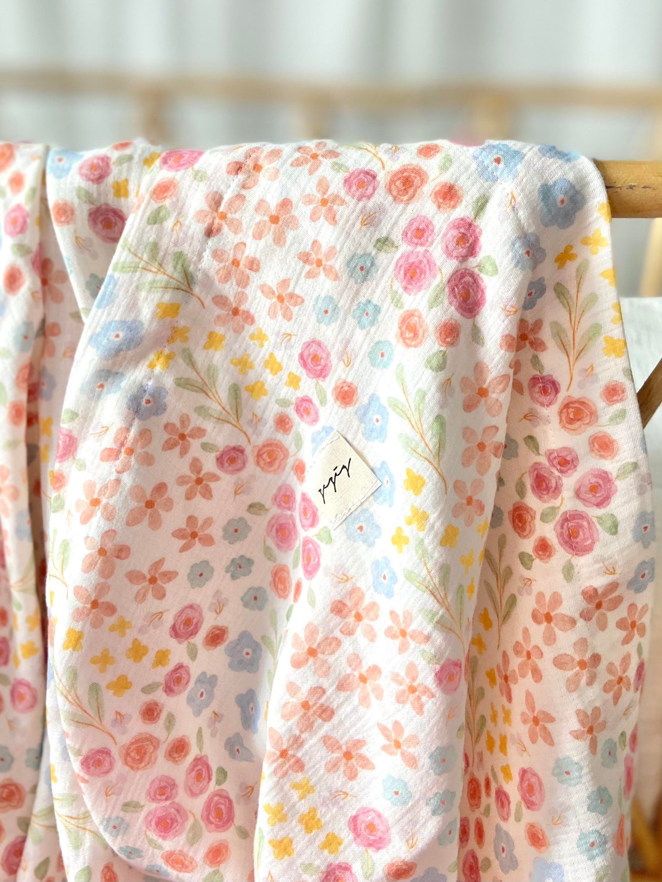 100% cotton double-layered woven muslin blanket. Printed with organic dyes.