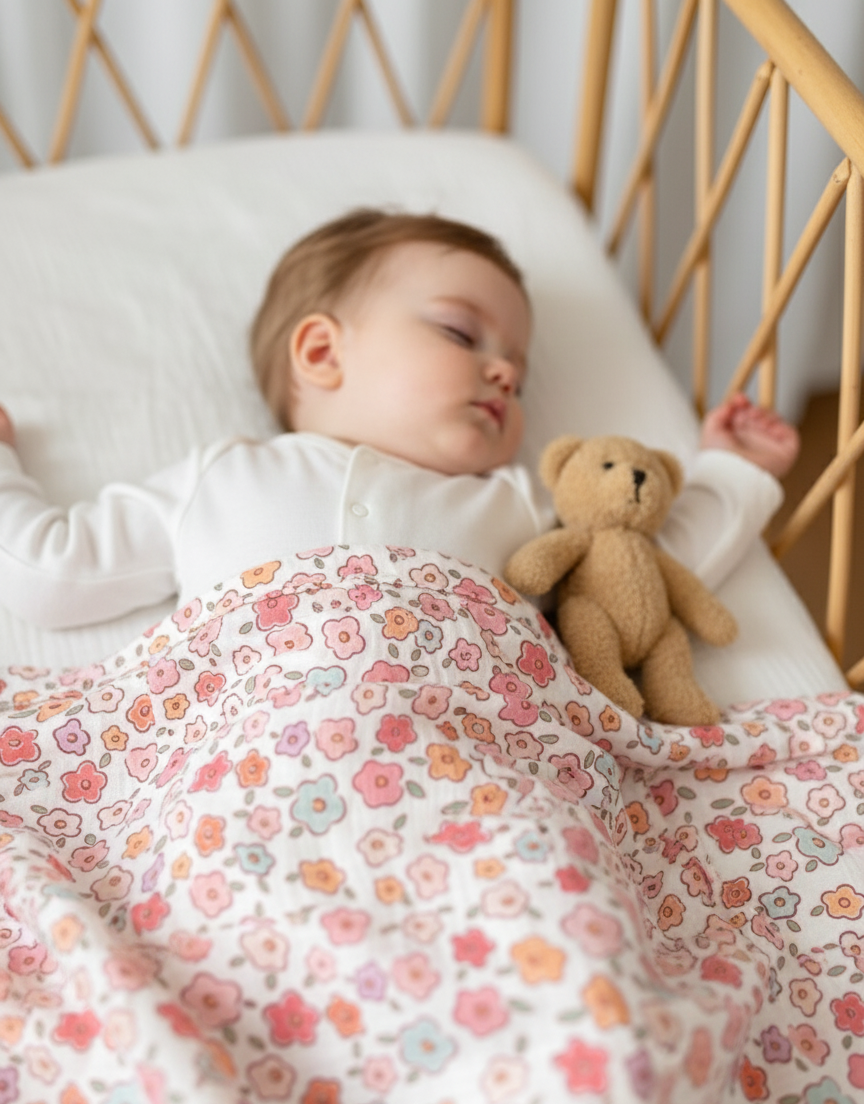 %100 pamuk çift kat dokunmuş müslin örtü. Baskısında organik boya kullanılmıştır.